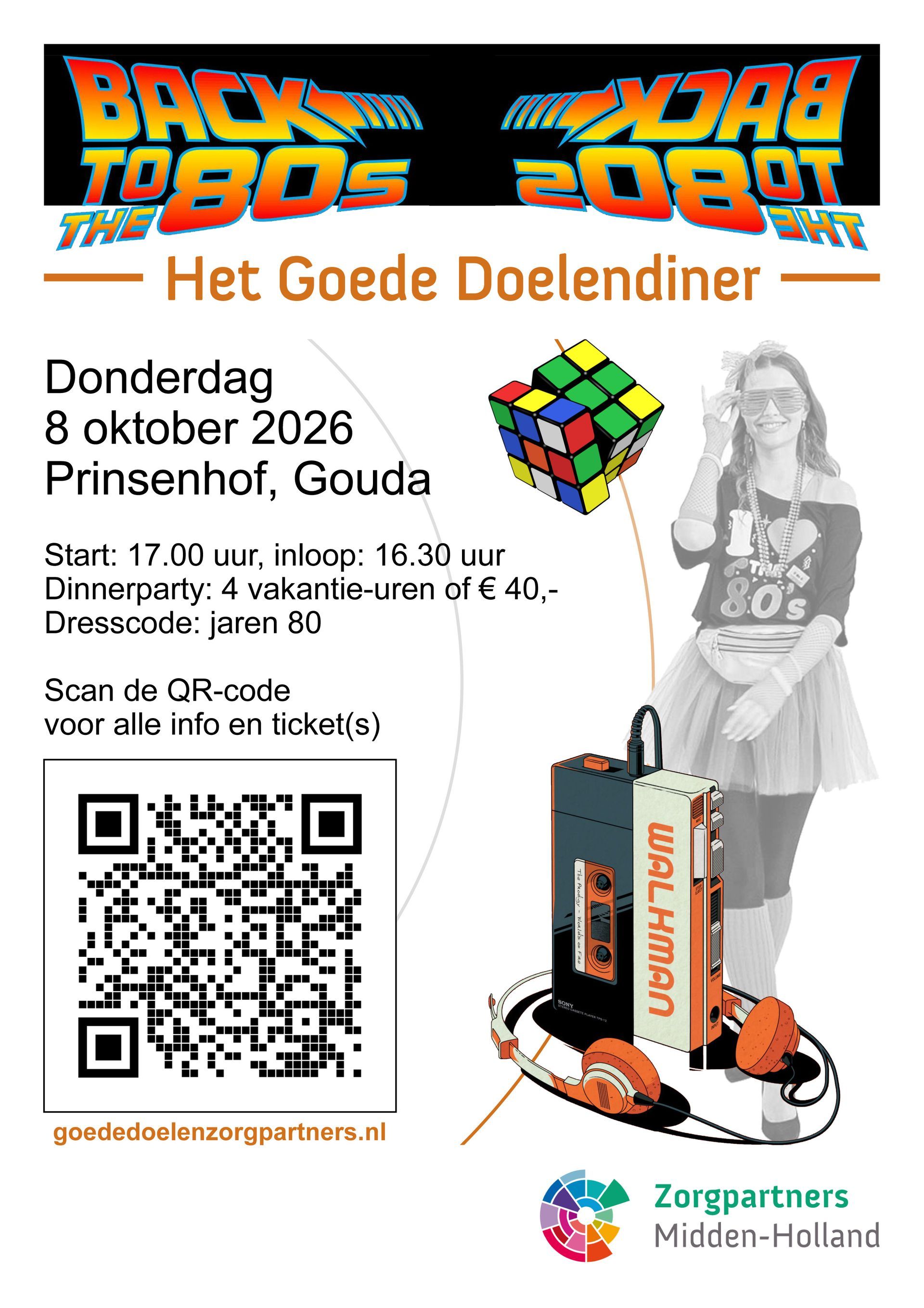Na het grote succes van MAMMA MIA! in januari 2025, gaan we opnieuw terug in de tijd met gezellige muziek, leuke spellen en een heerlijk diner in de jaren 80 stijl. Want 'Back To The 80's' is het thema van het Goede Doelendiner op donderdag 8 oktober 2026 van 17.00 tot 20.00 uur in Prinsenhof. Alle medewerkers van Zorgpartners Midden-Holland én introducees zijn welkom.