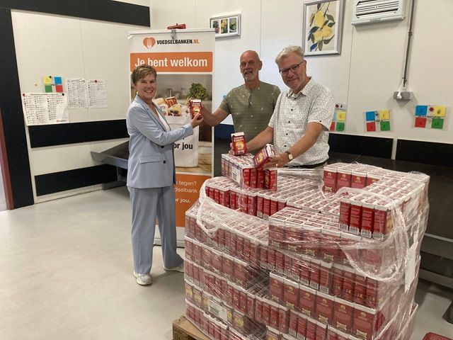 Afgelopen woensdag, 30 juli, schonken Stienet Bonefaas en Arie Pieter van Dijk namens stichting Goede Doelen Zorgpartners Midden-Holland 48.545 koppen koffie, ofwel een pallet met 1.387 pakken van 250 gram DE filterkoffie, aan loodscoördinator Aart Snijders.