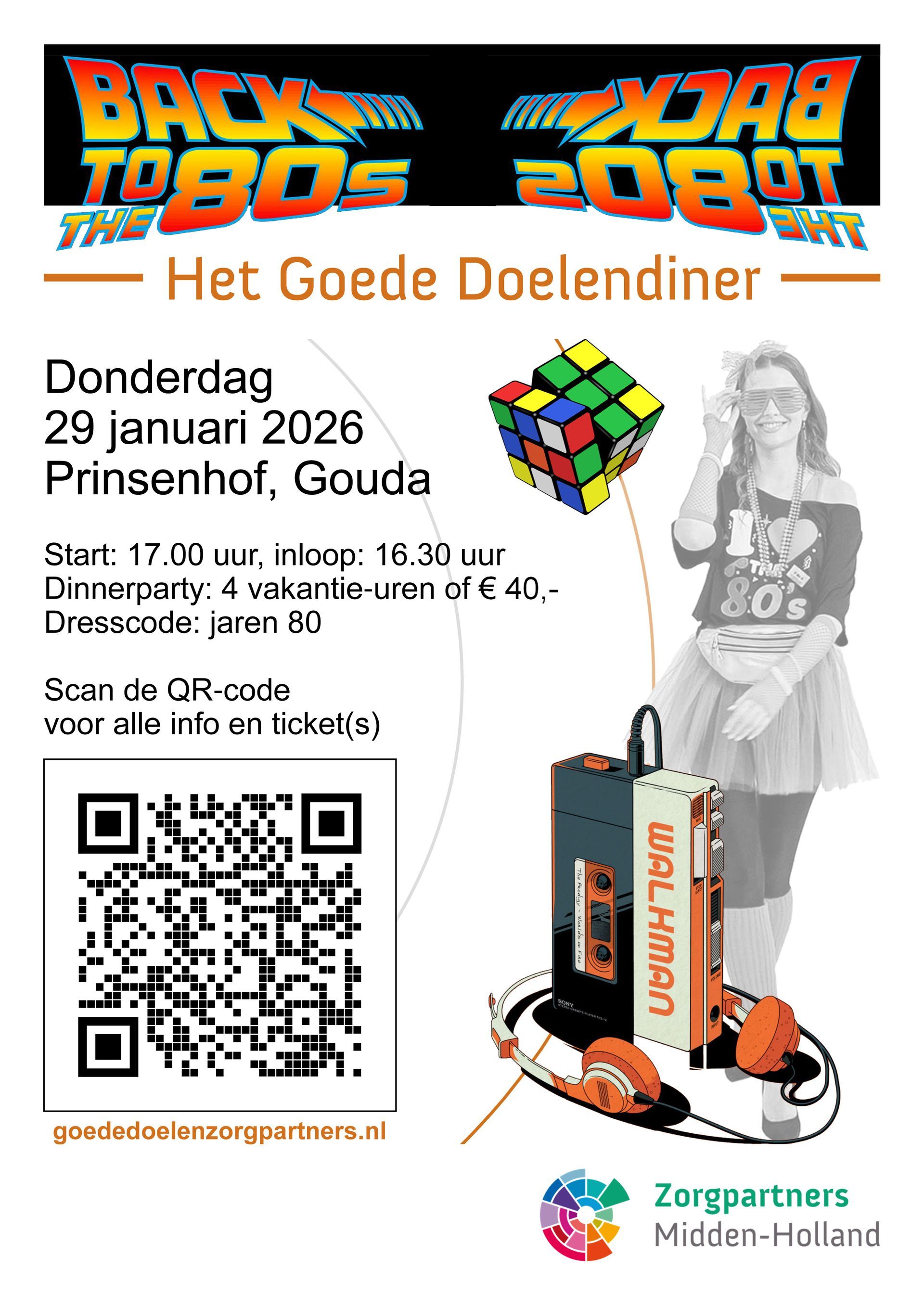 Na het grote succes van MAMMA MIA! in januari 2025, gaan we opnieuw terug in de tijd met gezellige muziek, leuke spellen en een heerlijk diner in de jaren 80 stijl. Want 'Back To The 80's' is het thema van het Goede Doelendiner op donderdag 29 januari 2026 van 17.00 tot 20.00 uur in Prinsenhof. Alle medewerkers van Zorgpartners Midden-Holland zijn welkom.